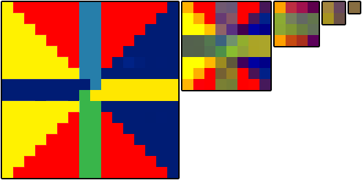 Mips are copies of the texture, each one half as wide and half as tall as the previous mip where the pixels have been blended to make the next smaller mip. Mips are created until we get all the way to a 1x1 pixel mip. For the image above all of the mips would end up being something like this